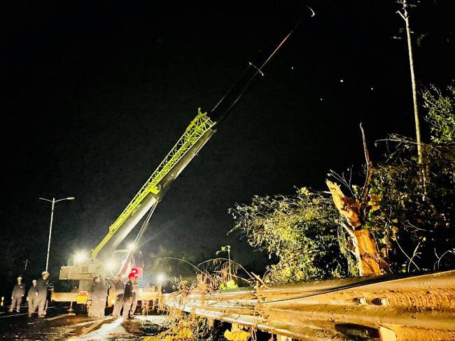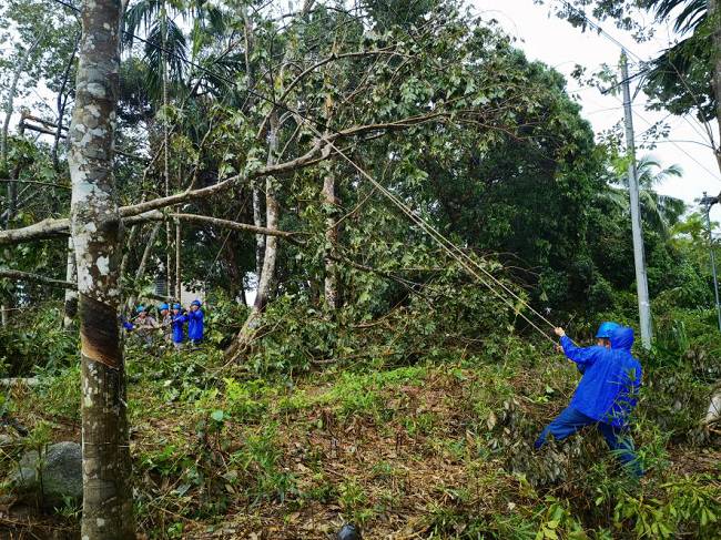 到達海南后,揭陽明利綜合能源發(fā)展有限公司支援海南抗災(zāi)搶險隊在澄邁縣緊鑼密鼓開展搶修復(fù)電工作。澄邁地貌相對平整,但林區(qū)覆蓋率較高,橡膠林香蕉園廣泛分布,臺風(fēng)摩羯過境后,林區(qū)樹木倒塌壓垮電線,線路損壞嚴重。為打通線路搶修通道,加快復(fù)電進度,公司搶險隊伍一邊組織大型施工機械快速重新組立電桿,一邊組織人員及時消缺搶修,力爭以最快速度恢復(fù)線路正常供電。