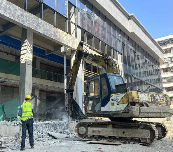 在“金葉匯”商業(yè)綜合體項(xiàng)目現(xiàn)場,玻璃幕墻安裝已封頂,工人正在對塔吊承臺進(jìn)行破除,后續(xù)將做好公共區(qū)域裝飾裝修、機(jī)電安裝等收尾工作,沖刺全面竣工驗(yàn)收節(jié)點(diǎn)。